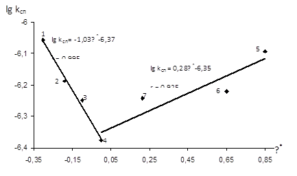 вказує на зростання швидкості реакції у випадку донорних замісників, які зменшують електронну густину на атомі оксигену епоксидну, збільшення кількості епоксидну призводить до вихідної рівноваги і, таким чином, збільшення швидкості реакції спостерігається в обох випадках: як при А1 -, так і при А2 – механізмі [7].