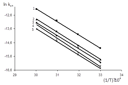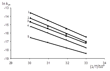 Рис. 3.12 Залежність ln kсп від 1/Т реакцій ацидолізу ЕХГ оцтовою кислотою у присутності різних каталізаторів (m=0,005 М) 1 — (C2 H5 )4 NBr; 2 — 4-Me-C5 H4 N; 3 — C6 H5 N(CH3 )2; 4 — 4-Br-C6 H4 N(CH3 )2; 5 — 3-NO2 -C6 H4 N(CH3 )