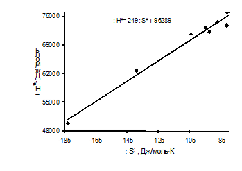 Користуючись тим, що активаційні параметри отримані як при варіюванні кислоти, так і при варіюванні каталізатора, представляється можливим побудувати єдину ізокінетичну залежність у координатах ΔН≠ =f(ΔS≠ ) для розглянутих вище реакційних серій, яка носить прямолінійний характер з коефіцієнтом кореляції r=0,990, що свідчить про наявність єдиного механізму реакції за даних умов.
