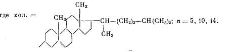 Участие холестеринового радикала в процессе I доказано путем сопоставления диэлектрических и ЯМР данных для холестеринового эфира поли-метакрилоил-со-аминолауриновой кислоты, а по аналогии и для ПХМ-n. Можно полагать, что процесс I, располагающийся при более низких температурах, следует отождествить с ориентацией μ± второй группы СОО в совокупности с холестериновым радикалом, простейший путь которой осуществляется при вращении относительно связи 3.