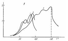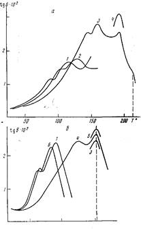 В ПХМ-10 температурное положение промежуточного мезофазного перехода (124°) совпадает с пиком диэлектрических релаксационных потерь (ниже он будет обозначен цифрой 1) при высоких частотах (рис. 2, б). Наблюдаемую при этих температурах область tg 6MaK c отличает значительная размазанность по температуре, что можно рассматривать как следствие наложения релаксационного процесса и мезоморфного структурного перехода. Естественно, что такое заключение может быть сделано только при наличии прямых данных ДСК [1].