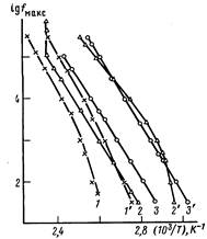 Рис. 3. Зависимость lg/максот обратной температуры для релаксационных процессов I (1-3) и II Ц'-З') в ПХМ-5 (1, Г), ПХМ-10 {2, 2') и в ПХМ-14 (3, 3')