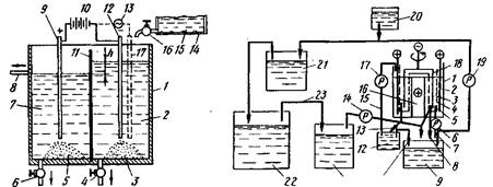На рис. 1 представлена схема аппарата для осуществления этого процесса. Электролизер состоит из катодного отделения 3, анодного отделения 5, катода 18, анода 2 и диафрагмы, отделяющей катодное отделение 3 от анодного отделения 5. Отработанный фиксирующий раствор перекачивают из резервуара 24 в циркуляционный резервуар 9 с помощью насосов 14 (необходимо отметить, что линия, идущая от насоса 14, далее разделяется на две линии; по одной раствор подается в катодное отделение 3, а по другой в резервуар 9); из резервуара 9 раствор поступает в катодное отделение 3. Отработанный фиксирующий раствор перетекает в резервуар 24 из резервуара 22 по линии 23. Резервуар 22 предназначен для проведения фиксажа и фактически не относится к аппаратуре для проведения описываемого процесса.