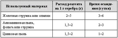 5. Восстановление серебра металлами основано на том, что серебро вытесняется из растворов его солей подавляющим большинством других металлов. Наибольшее применение для этой цели получили железо, алюминий и цинк, причём металлы используются в виде стружки, что значительно удешевляет процесс, так как могут использоваться отходы производства, или пыли. С увеличением поверхности соприкосновения металла с раствором скорость процесса возрастает. Перед применением стружку обезжиривают в 3%-ном растворе щелочи.