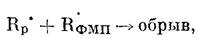 После достижения максимума скорость постполимеризации ТФЭ быстро падает. Это уменьшение скорости не может быть связано с выработкой мономера, поскольку его конверсия при достижении максимума скорости не превышает 10—20%. Естественно, связано это падение скорости с обрывом полимерных цепей. Обрыв растущих полимерных цепей может происходит либо из-за рекомбинации растущих макрорадикалов Rp * с радикалами, образовавшимися при радиолизе ФМП БФМП, время жизни которых весьма велико как в твердом, так и в жидком состояниях [5]