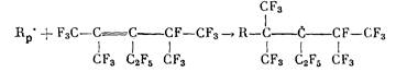 либо в реакции растущего макрорадикала ТФЭ с двойной связью ФМП с образованием малоактивного стабильного радикала, неспособного из-за стерических затруднений к дальнейшему продолжению цепи