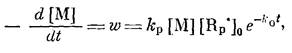 В обоих случаях должен наблюдаться линейный обрыв полимерных цепей. Тогда спад скорости постполимеризации ТФЭwво времени должен описываться уравнением