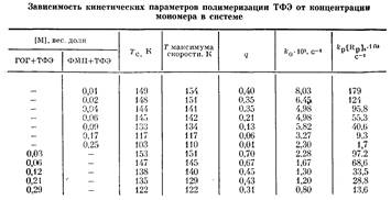Постполимеризация ТФЭ в радиолизованных стеклообразных растворах ТФЭ и ФМП наблюдается в узком температурном интервале в области расстекловывания системы (рис. 1,6). С ростом исходной концентрации ТФЭ в растворе Тс монотонно смещается в область низких температур, и соответственно снижается температурная область протекания полимеризации. При этом уменьшается и интегральный выход полимера (таблица).