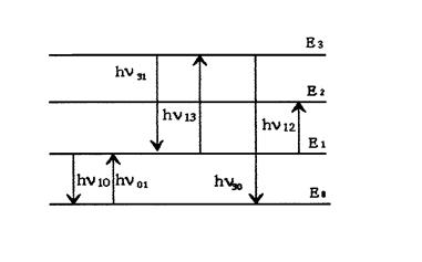 Горизонтальными линиями на рис.2.2.1. изображены уровни энергии различных состояний атома. Уровень Е0 это уровень основного состояния; Е1, Е2, Е3 — уровни возбуждённых состояний в порядке возрастания их энергии. Вертикальные стрелки соответствуют испусканию (стрелка вниз) или поглощению () фотона. Очевидно, что