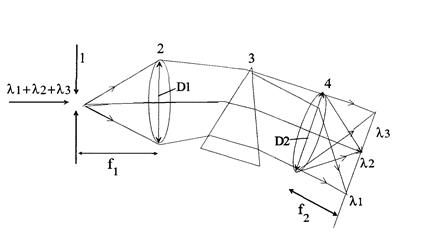 щель; 2 — объектив коллиматора (D1-его диаметр, f1-фокусное расстояние); 3 — призма;