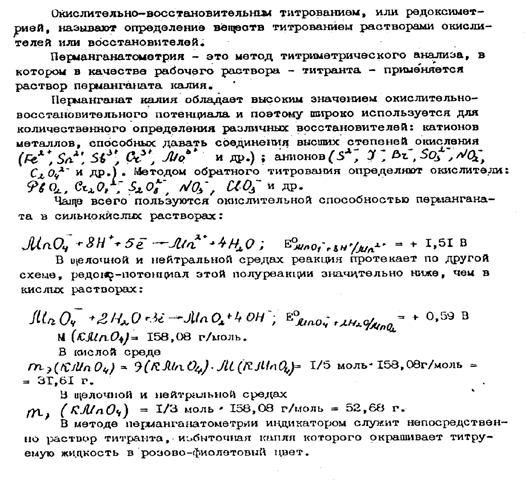 | 18 | Приготовление рабочего раствора перманганата калия и установление нормальной концентрации и титра по щавелевой кислоте. |