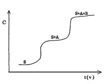 Фронтальный метод — простейший вариант хроматографии. Он состоит в том, что через колонку с адсорбентом непрерывно пропускают анализируемую смесь, например, компонентов А и В в растворителе S (рис. 1). В растворе, вытекающем из колонки, определяют концентрацию каждого компонента и строят график в координатах «количество вещества — объем раствора», прошедшего через колонку. Эту зависимость обычно называют хроматограммой или выходной кривой. На выходе из колонки собирают раствор, называемый элюатом. Вследствие сорбции А и В сначала из колонки будет вытекать растворитель S, затем растворитель и менее сорбируемый компонент А, а затем растворитель, компонент А и компонент В. Таким образом, удается выделить в чистом виде лишь один компонент смеси — наименее сорбируемый. Фронтальному методу отвечает хроматограмма вида (рис. 3.).