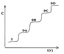 Вследствие этого новый элюент вытесняет компоненты, которые выходят из колонки в порядке возрастания взаимодействия с НФ. Выходная кривая этого метода имеет вид, показанный на рис. 2.