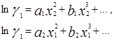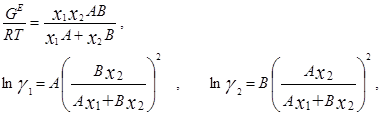Уравнение Маргулеса является наиболее старым из числа применяемых в настоящее время. Исследования Маргулеса были выполнены еще до того, как были сформулированы такие понятия, как фугитивность и коэффициенты активности, однако в сущности его предложения сводятся к представлению lnγ1 и lnγ2 в виде степенных рядов по составу: