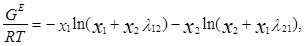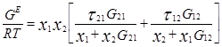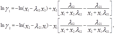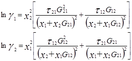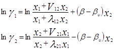 Уравнение Вильсона для бинарной смеси для избыточной свободной энергии смешения и для определения коэффициентов активности имеет следующий вид: