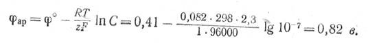 Нормальный электродный потенциал разряда ОН- -ионов составляет + 0,41 в, а нормальный электродный потенциал разряда ионов хлора равен + 1,36 в. В нейтральном насыщенном растворе хлористого натрия концентрация гидроксильных ионов около 1 ·10-7г-экв/л. При 25° С равновесный потенциал разряда гидроксильных ионов будет