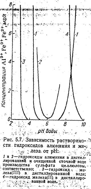 Растворимость гидроксида железа (II) в воде приведена на рис. 1, из которого видно, что этот коагулянт может применяться при рН > 9–10. Для уменьшения концентрации растворенного гидроксида железа (II) при более низких величинах рН производят окисление двухвалентного железа в трехвалентное. Процесс окисления осуществлять за счет растворенного в воде кислорода: 4FeSO4 + O2 + 2H2 O = 4Fe(OH)3 .