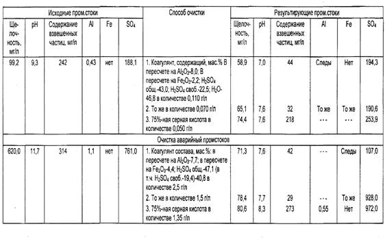 В 1997 в технологии очистки сточных вод был получен коагулянт из красного шлама. Сущность изобретения: красный шлам глиноземного производства обрабатывают 3–5% соляной кислотой. Полученный твердый остаток обрабатывают 50–55% серной кислотой. Полученную пульпу фильтруют и к полученному раствору добавляют концентрированную серную кислоту до ее общего содержания в растворе 25–50%. Полученный раствор выдерживают 10–20 ч. и отделяют полученный осадок. Осадок представляет собой неорганический коагулянт, содержащий компоненты в мас.%: смесь А12 (SO4 )3 *nН2 О, где n=6, 12, 14 и А12 (SO4 )3 *Н2 SO4 *12Н2 O в пересчете на А12 O3 -2–10, FеSO4 * Н 2 O в пересчете на Fе2 O3 – 2–10, Н 2 SO4 общая – 40–60 (в том числе Н2 SО4 свободная-20–40) и Н2 O кристаллизационная до 100%. Полученным коагулянтом обрабатывают щелочные сточные воды [9,11]. Примерные результаты обработки сточных вод приведены в таблице 2