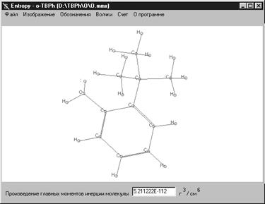 В начале работы с приложением пользователь производит загрузку файла, содержащего сведения о геометрии рассматриваемой молекулы, при этом осуществляется отображение структуры молекулы в окне приложения и расчет произведения главных моментов инерции данной структуры (рис. 2.3).