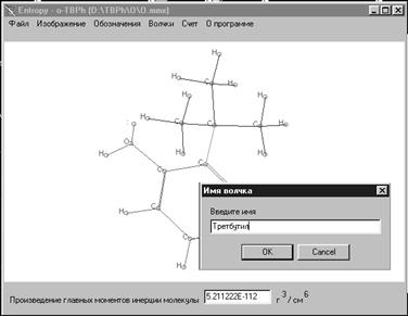 Если вращение по связи признается возможным и с каждым из атомов, образующих связь, связан, по крайней мере, еще один атом, то осуществляется автоматическое добавление к списку волчков избранной структуры наименее массивного из прилегающих к связи фрагментов. При этом производится расчет приведенного момента инерции волчка. Пользователем выполняется ввод названия волчка (рис. 2.4).