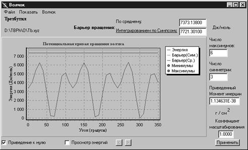 В форме параметров волчка пользователь может изменить значения числа симметрии и числа максимумов волчка, величину барьера вращения, внеся значения в соответствующие поля формы. Масштабирование потенциальной кривой осуществляется вводом масштабного коэффициента и нажатием кнопки Применить. Также в данной форме возможен просмотр потенциальной кривой в энергетических координатах исходного XYZ-файла, для чего следует сбросить флажок Приведение к нулю.