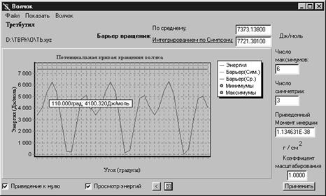 После ввода названия осуществляется переход к форме ввода параметров волчка, в которой следует произвести открытие файла с энергиями потенциальной кривой барьера вращения. При этом производится вывод изображения кривой, подсчет числа максимумов и расчет значения приведенного барьера вращения. Дополнительно к значению барьера, рассчитанному в соответствии с рекомендациями раздела 4.2, выводится значение
