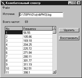 В форме ввода набора частот пользователь должен открыть log-файл HyperChem с записью колебательного спектра, после чего в таблице будут выведены номера частот и их значения в см-1. Выбором номера частоты и нажатием кнопки Удалить производится исключение частоты из спектра (рис. 2.7).