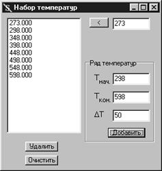 На этом завершается ввод необходимых исходных данных. Для проведения расчета следует только с помощью пункта Набор температур меню Счет задать значения температур, для которых должен быть проведен расчет составляющих энтропии. Форма ввода температур, представленная на рис. 2.8, не требует дополнительных пояснений. С ее помощью в набор температур могут быть введены как индивидуальные значения, так и наборы значений с постоянным шагом.