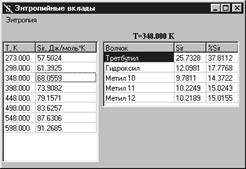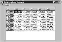 После ввода набора температур выбором пункта Расчет энтропийных вкладов меню Счет выполняется окончательный расчет составляющих энтропии. При этом вывод результатов производится как в форме суммарных вкладов для вещества, так и, для вкладов, обусловленных внутренним вращением и смешением конформеров, с расчетом индивидуального вклада в энтропию от каждого из волчков (рис. 2.9, 2.10). Информация, представленная в таблицах, может быть как полностью, так и частично скопирована для дальнейшего использования при проведении расчетов с помощью приложений, способных осуществлять получение данных из буфера обмена.