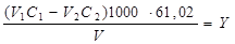 де V1 \ — об'єм розчину соляної кислоти, добавлений до проби води, см3; С1 — концентрація розчину соляної кислоти, добавленої до проби води, моль-екв/дм3; V2 — об'єм стандартного розчину бури, витрачений на титрування залишку соляної кислоти, см3; С2 — концентрація стандартного розчину бури, витраченого на титрування залишку соляної кислоти, моль-екв/дм3; V— об'єм проби води, см; 61,02 — молярна маса еквівалента гідрокарбонат-іонів.