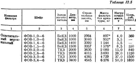 Нашей промышленностью серийно выпускаются (табл. 12.5) напорные вертикальные фильтры пяти типоразмеров. Высота Фильтрующей загрузки в фильтрах всех размеров принята 1>2 м. Наибольший диаметр напорного фильтра из условий удобства перевозки железнодорожным транспортом принят 3,4 м, фильтрующая площадь такого фильтра составляет 7,1м2 Поэтому при более или менее значительной производительности водоочистной установки приходится устраивать большое число фильтров и арматуры, что удорожает строительство и усложняет эксплуатацию фильтров. Число устанавливаемых напорных фильтров может быть сокращено примерно в 4 раза в случае применения горизонтальных напорных фильтров, площадь фильтрования которых составляет 28… 30 м2, или вертикальных двух — и трехкамерных фильтров.