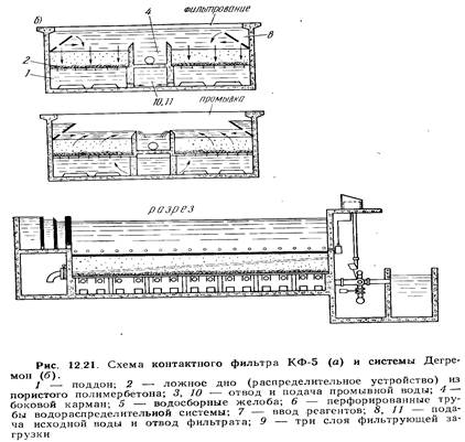 В системах муниципального, а также производственного водоснабжения нашел применение прямоточный открытый контактный фильтр КФ-5 (рис. 12.21, а) с трехслойной фильтрующей загрузкой (по 0,5 каждый). Верхний слой (керамзит, аглопорит, полимеры) имеет крупность зерен 2,3… 3,3 мм; средний (антрацит, керамзит, горелые породы) — 1,25… 2,3 мм; нижний (кварцевый или гранитный песок, горелые породы) — 0,8… 1,25 мм. Скорость фильтрования до 20 м/ч, интенсивность промывки 15 л/(с-м2), продолжительность — 6… 8 мин.