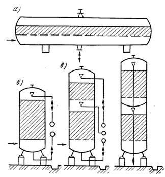 Рис. 12.22. Схемы напорных осветлительных фильтров. а—горизонтальный; б — вертикальный; в — двухкамерный вертикальный