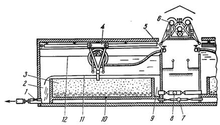 2 — нижний карман; 10 — пористая бетонная плита (дренаж); 3 — песчаный фильтрующий слой; 9 — верхний карман; 7 — трубопровод фильтрованной воды; 6 — механизм привода рыхлителя; 5 — трубопровод, подающий промывную воду к рыхлителю; 5 — трубопровод, подающий в корпус фильтра осветляемую воду; 11, 12 — уровни воды при промывке и фильтровании; 4 — каретка рыхлителя, движущаяся по монорельсу; 13 — трубопровод, подающий промывную воду; 1 — канализационная труба для отвода промывной воды