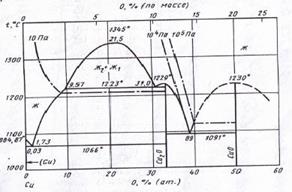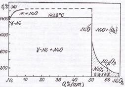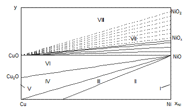 Построена диаграмма состояния Cu – Ni – O и проанализирована химическая устойчивость медно-никелевых сплавов. Установлено, что медно-никелевые сплавы окисляются кислородом воздуха в нормальных условиях. Подтверждено, что окисление никеля из сплава на воздухе заканчивается образованием фазы нестехиометрического состава NiOx, что подтверждается диаграммой состояния Ni – O (рис. 1.4., [14]). Однако установлено, что в нормальных условиях и при повышенной температуре соединение NiO2 не образуется, что не подтверждается диаграммой 1.4.