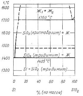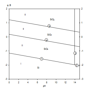Область I — область иммунности γ-фазы, интерметаллидов и чистого кремния, когда сплав не подвергается коррозии. Выше линии 1 кремний термодинамически неустойчив и окисляется до кремнезема (