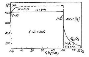 Построена диаграмма состояния Ni-Si-Oи проанализирована химическая устойчивость никель-кремниевых сплавов. Установлено, что никель-кремниевые сплавы окисляются кислородов воздуха в нормальных условиях. Подтверждено, что окисление никеля из сплава на воздухе заканчивается образованием фазы нестехиометрического состава NiOx, что подтверждается диаграммой состояния Ni-O (см. рис.1.4.). Однако установлено, что в нормальных условиях и при повышенной температуре оксид NiO2 не образуется, а его образование возможно лишь при давлениях порядка 1030 атм.