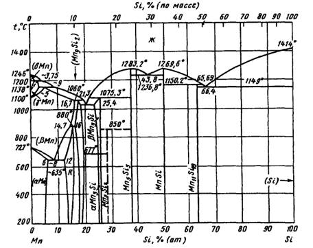 На рисунке представлена уточненная диаграмма состояния Mn-Si. Для построения диаграммы использованы результаты термического, микроскопического и рентгеновского анализов, а также расчетные данные. Сплавы выплавляли в индукционной печи из Mn чистотой 99,95% и Si чистотой 98,9% (по массе).