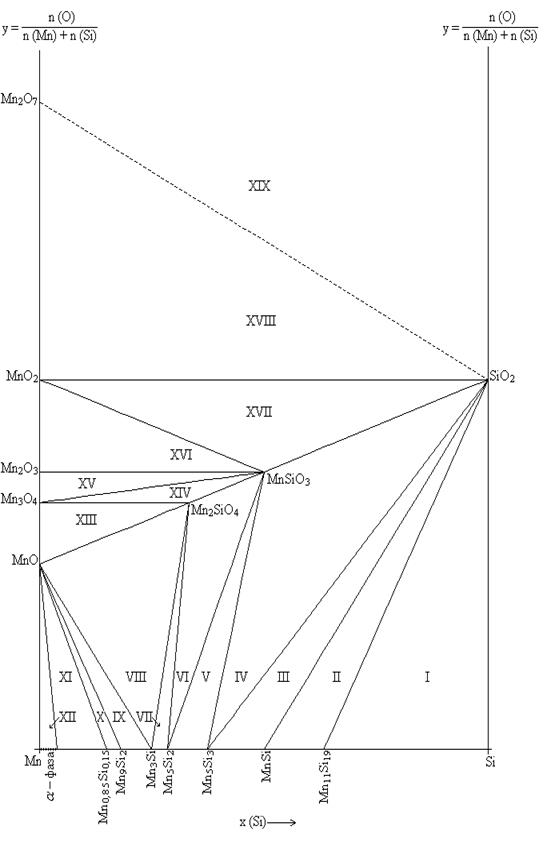 IV | Mn5Si3 – MnSiO3– SiO2 | 2Mn5Si3 + 4SiO2 + 11O2 = 10MnSiO3 |