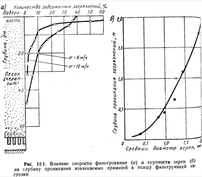 1) задержание примесей на поверхности фильтрующего слоя (пленочное фильтрование) описываемое формулой Хазена δ = 0,01 (v*d3 )0.5, где δ — диаметр наименьших задерживаемых частиц, мм; d3 — эффективный диаметр зерен загрузки, мм; v— скорость фильтрования до 10 м/ч;