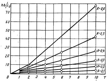 Это свидетельствует о возможности построения графика зависимости h-b/i0от критерия Т и параметра А, который может быть использован для определения потери напора в любом рассматриваемом случае. Подобный график (рис. 12.8) построен на основании расчетов по формуле (12.35) с использованием уравнения (12.10). График позволяет определить прирост потери напора в фильтре в любой момент времени, если известны параметры процесса фильтрования a, bи А, а также гидравлический уклон t0. Обобщенный график (рис. 12.8) воспроизводит характер изменения потери напора.