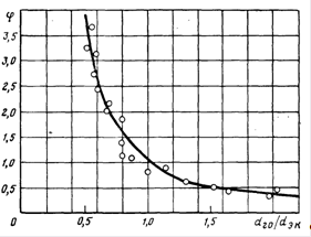 Задача определения расчетной скорости фильтрования и параметров загрузки фильтров при оптимальном режиме их работы сводится к совместному решению уравнений (12.18) и (12.44), в которых заданными величинами являются параметры фильтрования a/b, bи А (определяются по результатам технологического анализа воды): продолжительность рабочего цикла (в соответствии с требованиями СНиП 2.04.02—84 расчетная продолжительность фильтроцикла принимается 12 ч); продолжительность защитного действия загрузки t3 назначается в соответствии с принятым для оптимального режима отношением t3 /tu.Предельная потеря напора Нпр назначается в соответствии с высотной схемой водоочистного комплекса. Неизвестными величинами в уравнениях (12.18) и (12.44) остаются скорость фильтрования v, толщина слоя загрузки х, эквивалентный диаметр зерен йэ и степень неоднородности загрузки ср. Последние две величины взаимосвязаны, так как зависят от зернового состава фильтрующей загрузки. Эквивалентный диаметр d3 вычисляют. Параметр ф находят по экспериментальному графику (рис. 12.10) по величине отношения d20 /d3.Таким образом, имеем три неизвестных при двух уравнениях: скорость фильтрования, толщину слоя фильтрующей загрузки и ее зерновой состав. Поэтому задача расчета фильтров на оптимальный режим их работы имеет несколько решений. Следовательно, для получения одного определенного решения необходимо задаться или скоростью фильтрования, или толщиной слоя загрузки, или ее зерновым составом. Задавшись, например, зерновым составом фильтрующей загрузки, расчетом определяют ее необходимую толщину и скорость фильтрования. Для расчетов удобно преобразовать уравнение (12.44), решив его относительно толщины слоя х. Тогда оно примет вид