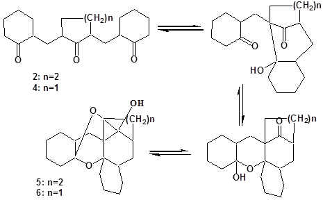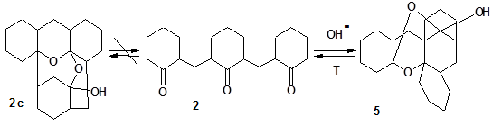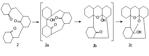 По схеме Тиличенко [8], циклизация начинается с взаимодействия карбонильной группы первого циклогексанонового кольца со свободной a-метиленовой группой третьего цикла 2 а и сопровождается образованием двух следующих друг за другом полуацетальных форм 2 b и 2 c :