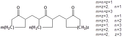 Такие же продукты циклизации были получены с другими алициклическими 1,5,9-трикетонами, содержащими два шестичленных цикла и один семичленный цикл в структуре [14].