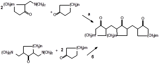 Нессиметричные трикетоны получаются в качестве побочных продуктов в результате реакции переаминометилирования по пути а.