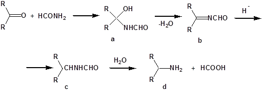 На первой стадии происходит нуклеофильное присоединение формамида к карбонильной группе с образованием соединения (а). Последующее отщепление воды приводит к образованию имина (b), а при гидридном восстановлении он переходит в N-формилпроизводное (c). При щелочном или кислотном гидролизе последнего образуется амин (d).