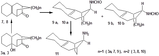 Известны примеры введения в реакцию Лейкарта кетонов каркасной структуры [19-21]. Так, трициклен 7 в результате реакции Лейкарта [19] образует стереоизомерные по мостиковому углеродному атому формиламины 9 а, b с преимущественным содержанием изомера 9 а с аксиальным расположением формиламинного заместителя, который легко переходит в соответствующий амин 11 путем щелочного гидролиза [22]. Гидроаминирование по Лейкарту близкого аналога соединения 7 – трициклена 8, также приводит к смеси стереоизомерных продуктов 10 a, b, однако в этом случае преобладает изомер 10 b с экваториально расположенной формиламинной группой, т.е. стереохимия гидроаминирования карбонильных групп кетонов 7 и 8 противоположна.