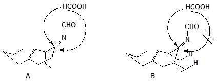 Причина этого кроется в том, что в пятичленном цикле соединения 7 не проявляются 1,3-диаксиальные взаимодействия, характерные для шестичленных циклов, и подход гидрид-иона со стороны пятичленного цикла менее затруднен. На приведенной ниже схеме показано, что подход восстановителя в молекуле интермедиата А возможен с обеих сторон двойной связи С=N, тогда как в молекуле интермедиата B он с одной стороны блокирован: