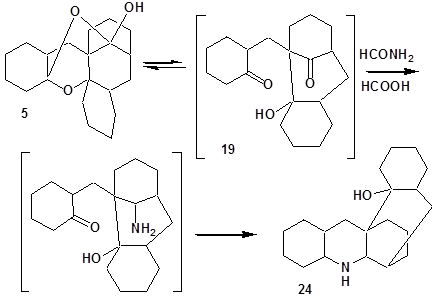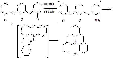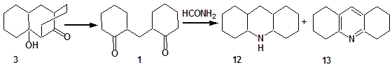 Соответствующий трициклену 8 кетол 3 в условиях реакции Лейкарта дециклизуется и в реакции с формамидом дает пергидро- и октагидроакридины 12 и 13 [20-22]: