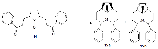 Если в реакцию Лейкарта вводится дикетон или соединение, содержащее наряду с карбонильной группой гидроксил, карбоксил, то реакция обычно не останавливается на стадии образования аминов, а сопровождается циклизацией [24, 25]. Таким примером может служить введение в реакцию гидроаминирования арилалифатического 1,5,9-трикетона 14 [25]. При микроволновом облучении в течение 1 минуты диастереомерной смеси трикетона 14 с формиатом аммония в этиленгликоле образуется диастереомерная смесь третичных аминов 15 а и 15 b с выходом 87 % в соотношении 2:1, разделение которой проводилось колоночной хроматографией.